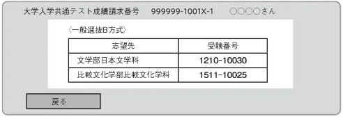 Web受験番号照会システムのトップ画面にある入力欄に「R9大学入学共通テスト成績票」に記載されている番号(英数字12桁)および生年月日(8桁)を入力する。「R9大学入学共通テスト成績票」に記載されている番号が「999999-1001X-1」の場合は「9999991001X1」。生年月日が2008年2月8日の場合は「20080208」。