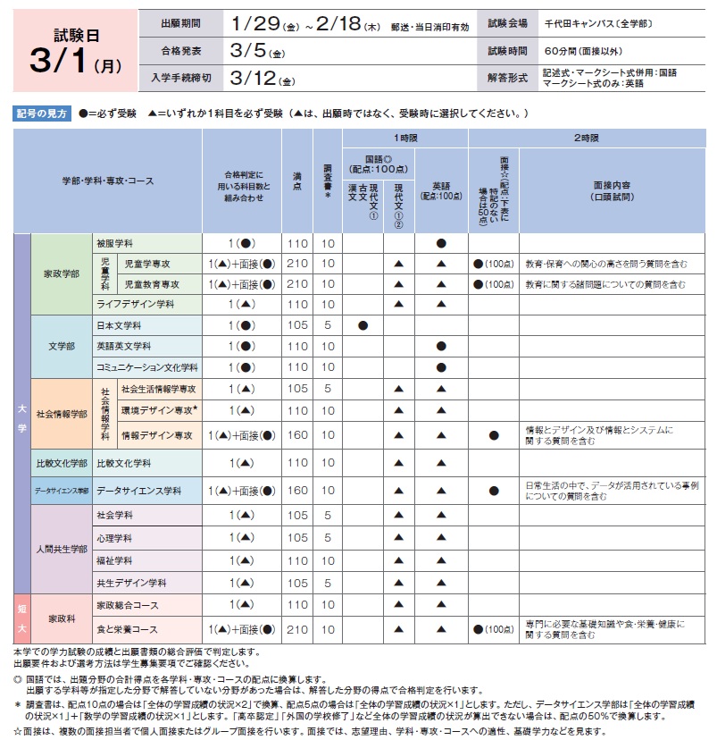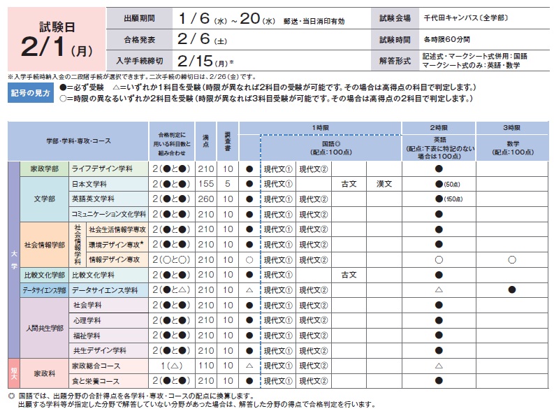 - 学力試験の成績、面接(一般選抜A方式Ⅱ期の家政学部児童学科、社会情報学部社会情報学科情報デザイン専攻、データサイエンス学部データサイエンス学科、短期大学部家政科食と栄養コースのみ実施)と調査書等を総合して合否を判定します。また、「英語資格・検定試験の成績」を提出した場合、それを換算した得点と「英語の学力試験の成績」を換算した得点のうち、高得点を採用します。