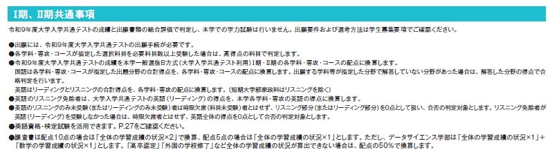 - 事前に大学入試センターに出願し、令和9年度大学入学共通テストを受験してください。なお、志望学科・専攻・コースが指定した試験科目を必ず受験してください。試験科目のうち、1科目でも未受験の科目がある場合は、不合格とします。