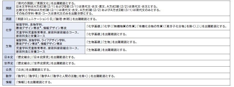 Ⅰ期(2/1、2/2)・Ⅱ期(3/1)における各科目の出題範囲および出題分野について