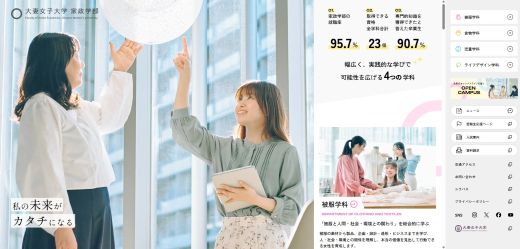 被服学科、食物学科、児童学科、ライフデザイン学科の4学科の学びのポイント、研究室紹介、卒業生インタビューなど、学科選びの参考になる情報を掲載しており、スマートフォンでも見やすく、知りたい情報にすぐアクセスできるようになっています。
