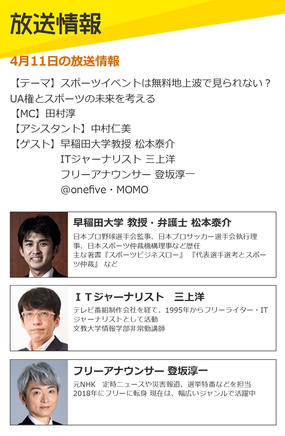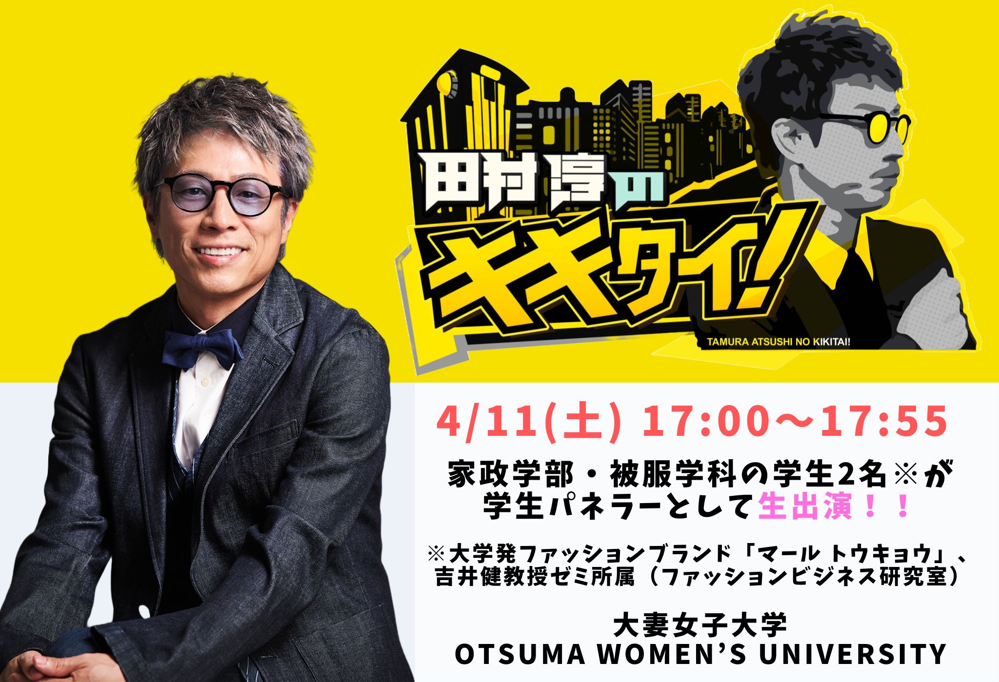 4月11日の放送では、「スポーツイベントは無料地上波で見られない?UA権とスポーツの未来を考える」をテーマに、本学被服学科・吉井ゼミ4 年の齋田結愛さんと杉村璃さんが学生パネラーとして参加し、MCの田村淳氏をはじめ、中村仁美アナ、そして専門家の方々と議論します。