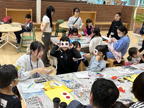当日はあいにく朝から強雨でしたが、徐々に参加者が増えて、参加者が自身で工作したメガネに色を塗ったりシールを貼ったりするなどして和気あいあいとした雰囲気のなかイベントを終えることができました。