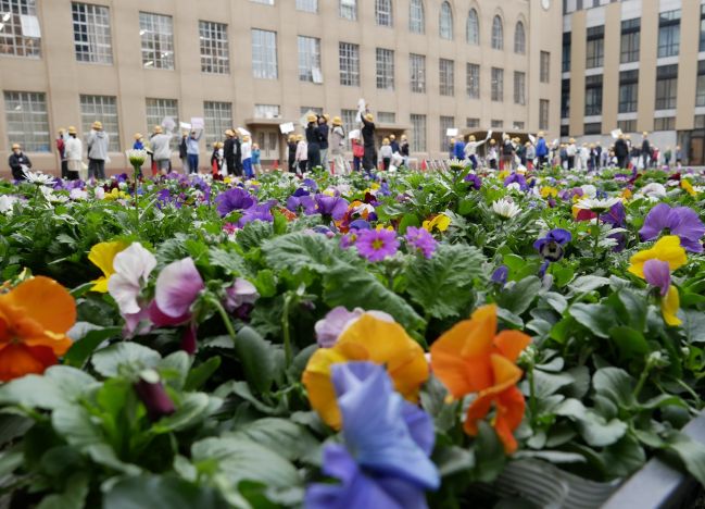 これは、家政学部児童学科「児童学基礎体験演習」受講の学生67人と教員、九段幼稚園、九段小学校、三番町町会、(株)プランナーワールド、子育て広場「あい・ぽーと麹町」、千代田区社会福祉協議会と本学地域連携推進センター職員が連携・協力して行う花植え(アダプト)です。